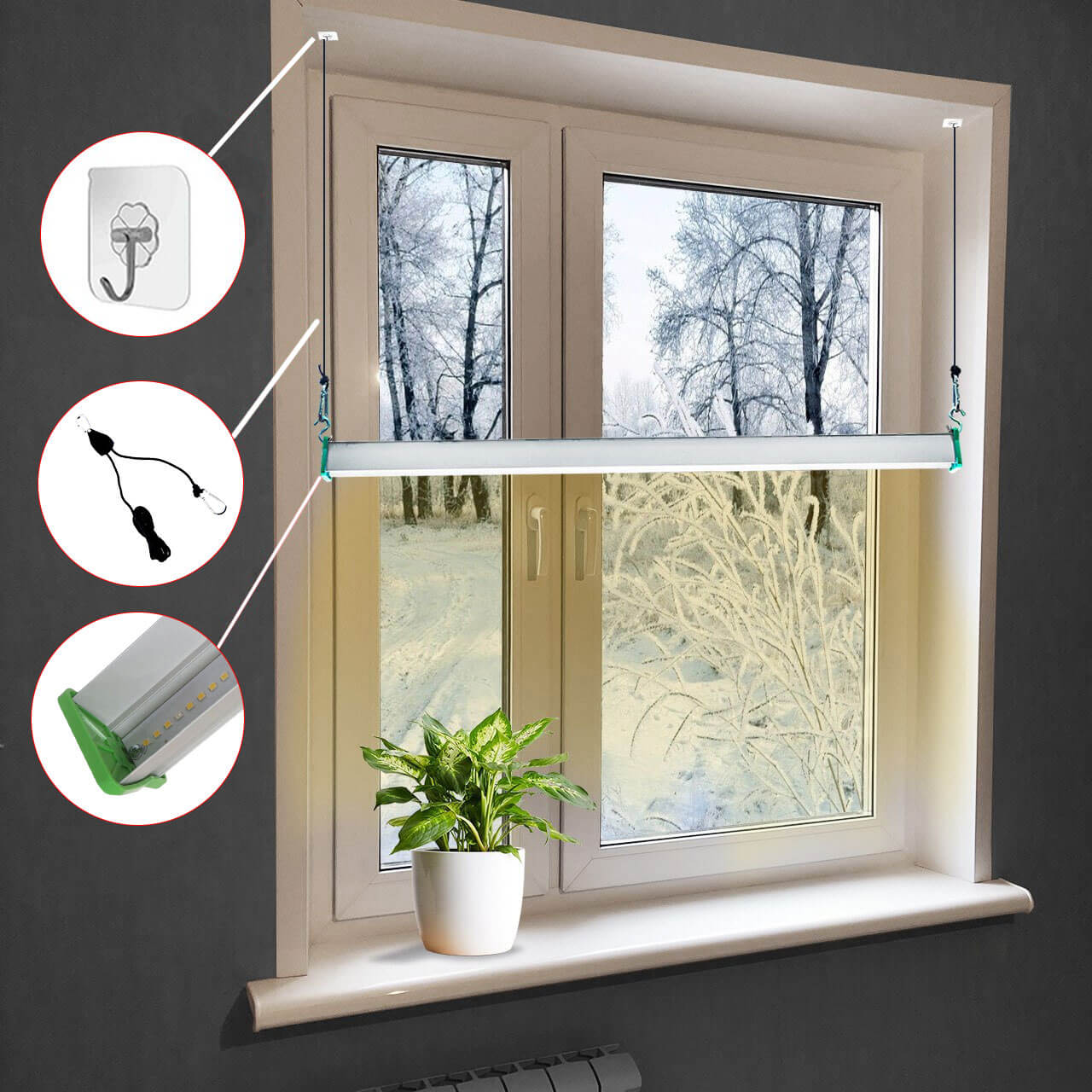 Зимой фитолампа на подоконник устанавливается простым способом. Пользователь приклеивает к верхнему откосу два крючка и спускает светильник на регулируемых подвесах на нужную высоту. Так в квартире появляется светлая зона для зимнего сада.